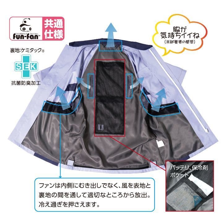 表地と裏地の間に空気を通し、必要な所から風を送り出す仕組み。風は「脇の下」「肩甲骨」「首後ろ」から放出、効率的に涼しさを届けます。裏地背中部のポケットにはバッテリの他、保冷剤を入れて涼しさをアップできます。