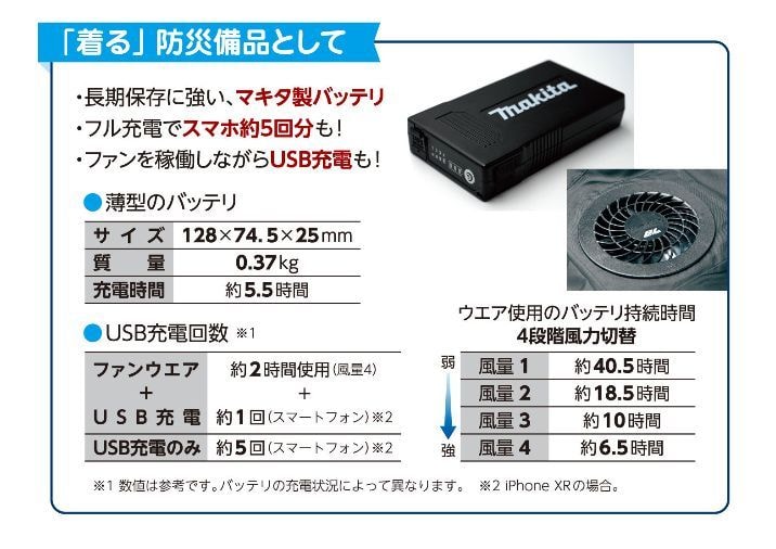 ファンユニットとバッテリはマキタ製。バッテリの自然放電が少なく、長期保存に適しています。防災用としても安心して備えられます。