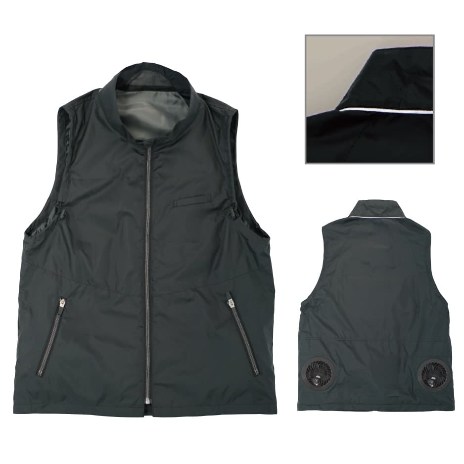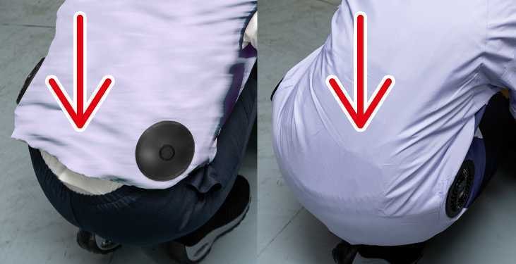 ファンから取り込まれた空気を表地と裏地の間に通し、「脇の下」「肩甲骨」「首の後ろ」あたりから放出します。この仕組みで効率良く体を冷やします。