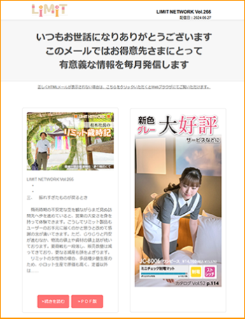 レディースユニフォーム リミット株式会社では、新商品や特別なご案内(不定期)、「社長のLIMIT NETWORK」(12月を除く毎月末頃)などの各種お知らせをメールでお届けしています。
